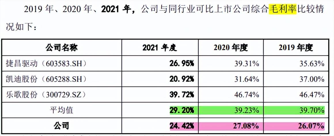 以2021年为例,豪江智能毛利率仅为24.42%,而同期捷昌驱动、凯迪股份、乐歌股份等可比上市公司毛利率分别为26.95%、20.92%、39.72%;虽高于凯迪股份,但仍低于行业平均值5个点,2021年毛利率相较2020年下降了2.66个百分点。2022年一季度毛利率为23.32%,较上年同期下降3.01个百分点,主要原因包括:机器设备折旧摊销增长较快以及原材料中芯片、塑料件、信号线等材料的采购价格上涨。