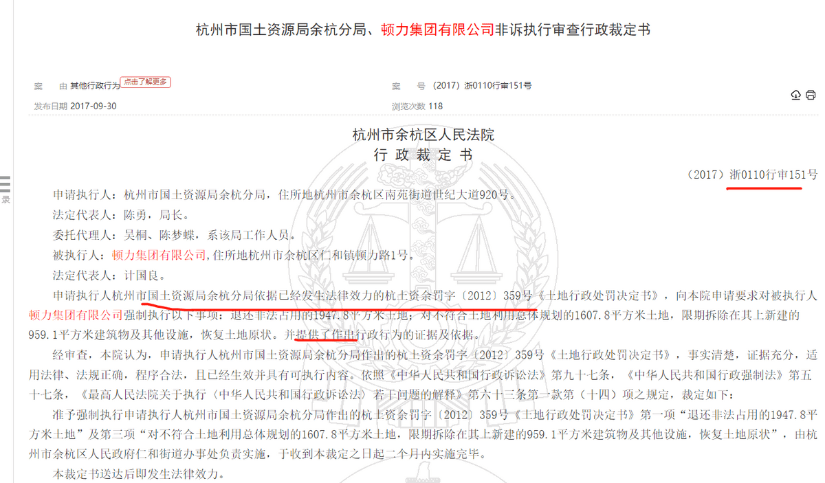 顿力集团有限公司系公司2020年和2021年内销第二大客户,为智慧医养第一大客户,分别采购了2,412.77万元和2,263.04万元,占比为3.87%和2.96%。查阅裁判文书网,顿力集团曾因非法占用土地资源被强制执行,据(2017)浙0110行审151号文件显示,余杭区浡强制执行申请执行人杭州市国土资源局余杭分局作出的杭土资余罚字〔2012〕359号《土地行政处罚决定书》第一项“退还非法占用的1947.8平方米土地”及第三项“对不符合土地利用总体规划的1607.8平方米土地,限期拆除在其上新建的959.1平方米建筑物及其他设施,恢复土地原状”。