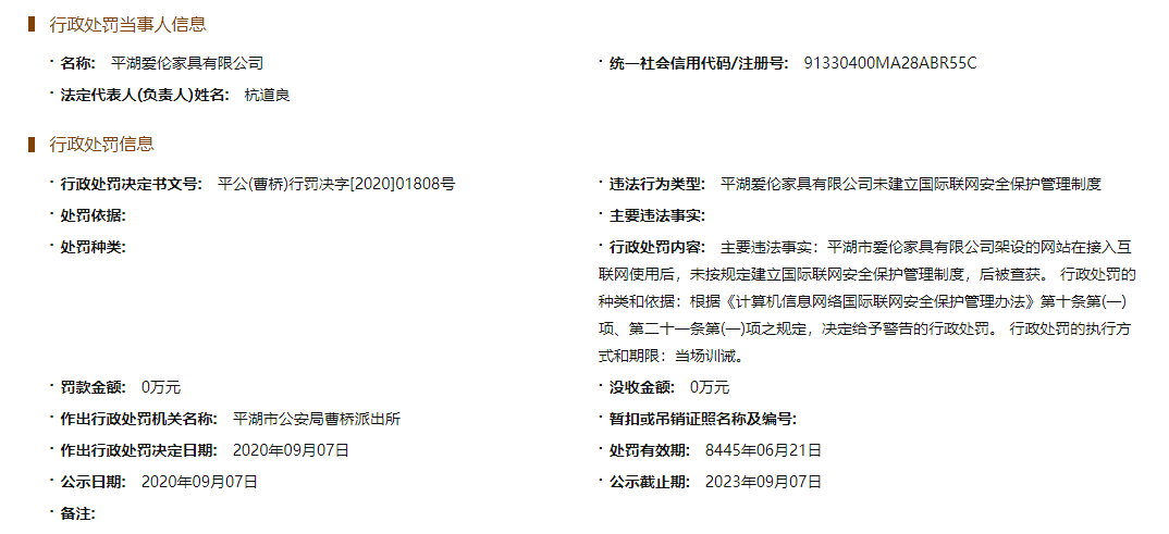平湖爱伦家具有限公司和平湖奈西贸易有限公司为公司的第四大客户,据平公(曹桥)行罚决字[2020]01808号文件显示,平湖爱伦家具有限公司未建立国际联网安全保护管理制度受当场训诫。