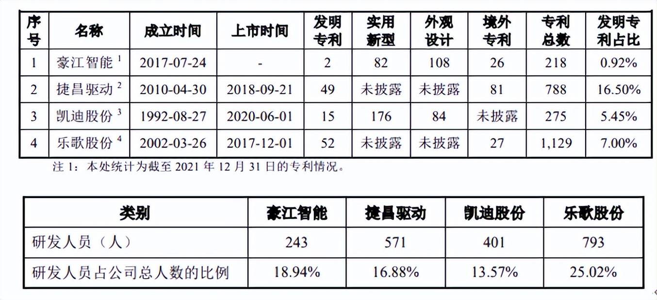 截至2021年12月31日,豪江智能及其子公司研发人员总数为243人,占员工总数的比例为18.94%,公司研发投入、研发人员保持较高水平。从数量占比上看,公司研发费用率和研发人员占比均在可比同行的中高水平,但从研发成效来看,却多少有所欠缺。