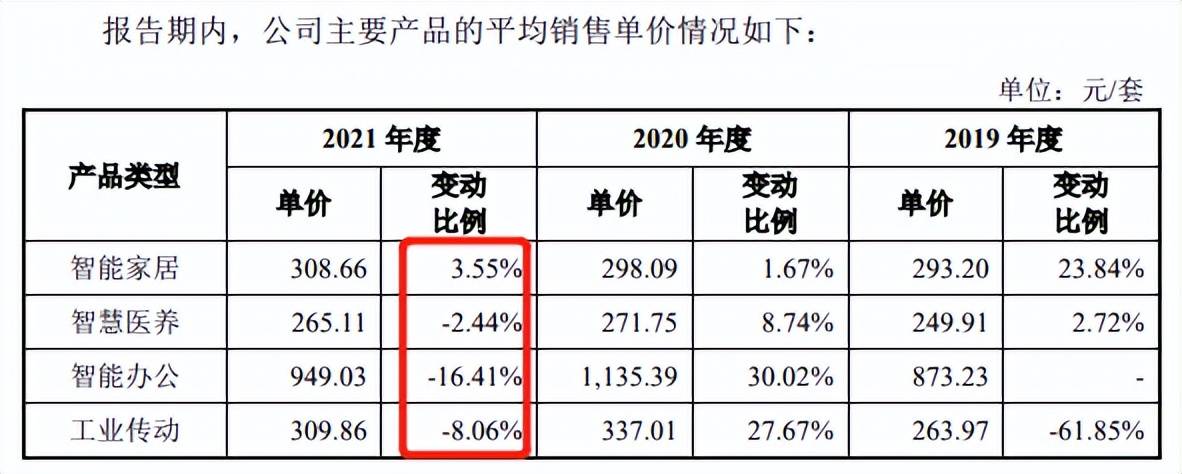 营收增长更多着眼于产品的单价上,报告期内,豪江智能主要产品的平均销售单价由2020年的上升变成2021年的多数下降,细分上看,智能办公在2020年的单价显示异常走高。