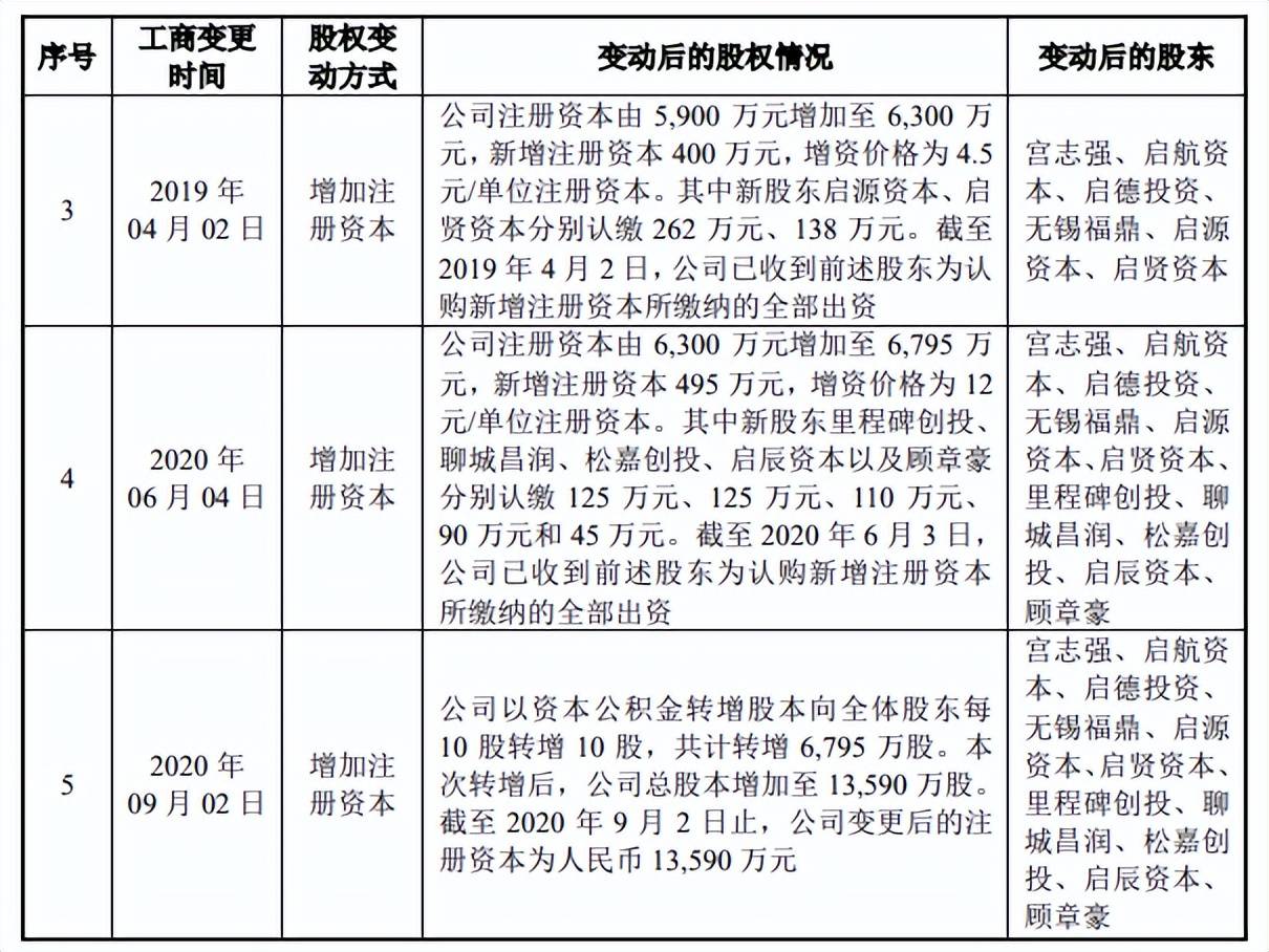 公司设立以来共进行了5次增资,2017年12月26日新增注册资本500万元全部由新股东启德投资以2元/单位注册资本的价格认缴。2018年04月24日,新增注册资本400万元全部由新股东无锡福鼎以4元/单位注册资本的价格认缴。2019年04月02日新增注册资本400万元,增资价格为4.5元/单位注册资本,其中新股东启源资本、启贤资本分别认缴262万元、138万元。