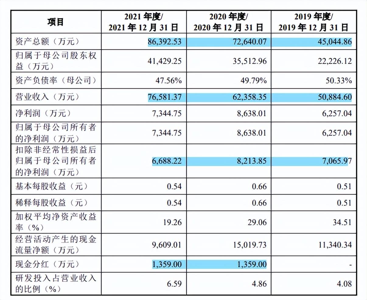 2019-2021年,豪江智能营业收入分别为5.088亿元、6.236亿元及7.658亿元,分别实现净利润6,257.04万元、8,638.01万元及7,344.75万元,实现扣非净利润7,065.97万元、8,213.85万元、6,688.22万元。随着公司的净利润、毛利率在2021年均呈下降趋势,其中净利润同比下滑14.97%、扣非净利润下滑18.57%、2021年毛利率相较2020年下降了2.66个百分点;公司2021年出现了增收反降利的情况。