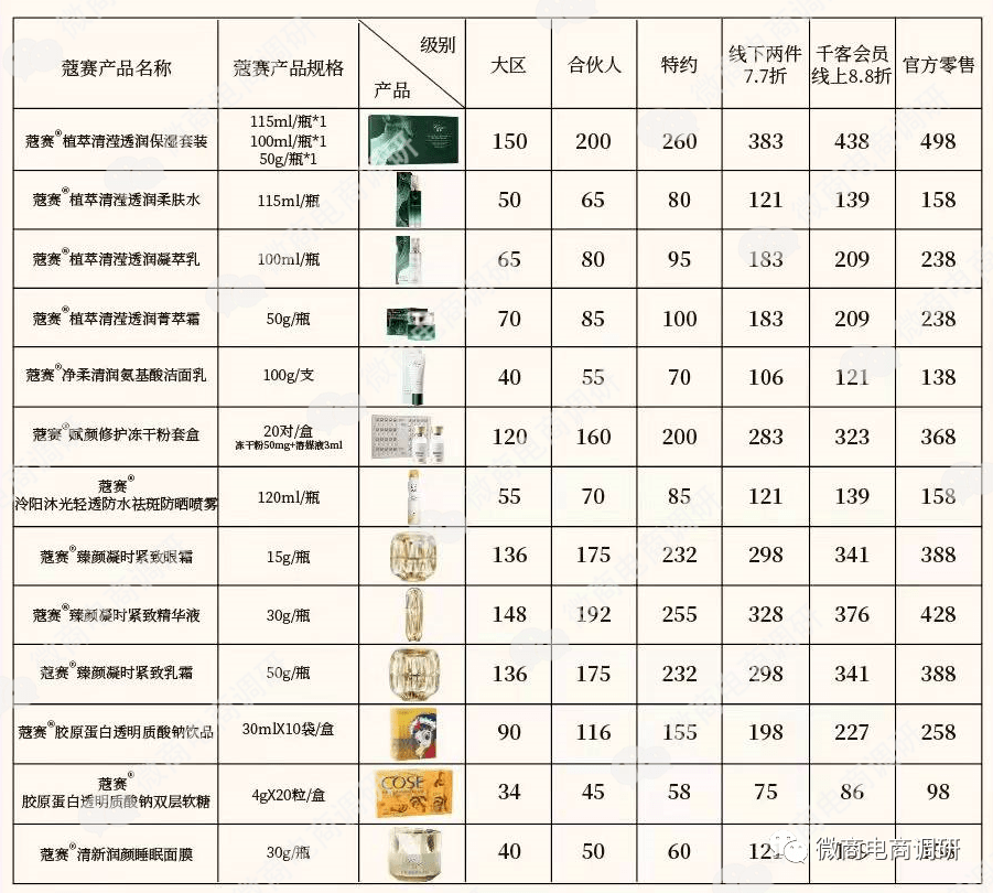 文章的最后,我们再来关注一下蔻赛现行的奖金制度,据经销商提供的产品价格表显示,蔻赛的代理商分为多个级别,每个级别对应的拿货折扣是不一样的,我们以零售价为498元的蔻赛植萃清滢透润保湿套装为例,千客会员线上购物享8.8折,拿货价为438元;线下两件为7.7折,拿货价是383元;特约拿货价是260元;合伙人的拿货价为200元;大区的拿货价为150元。