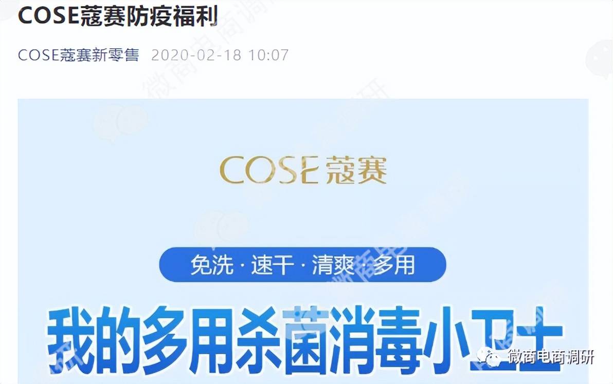 在2020年年初新冠疫情肆虐之时,蔻赛还推出了标有“防疫福利”字样的产品,即“蔻赛免洗抑菌凝胶”。