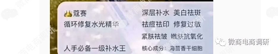 再比如“蔻赛循环修护水光精华”这款产品,“寇赛护肤总经销”、“蔻赛总代理”、“蔻赛国际主帐号”、“COSE蔻赛国际总部”等多个公众号都认为该产品具有“美白祛斑”等作用。
