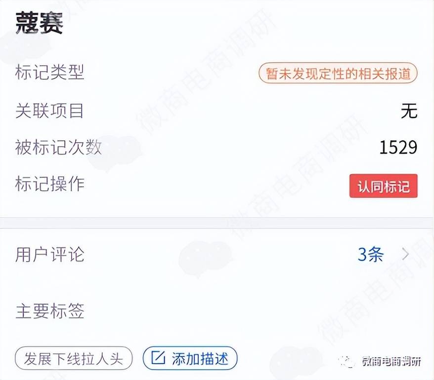 眼下,在腾讯灵鲲金融风险监管平台上,“蔻赛”这个关键词已被标记了1529次,虽然标记类型是“暂未发现定性的相关报道”,不过其主要标签有“发展下线拉人头”的字样。