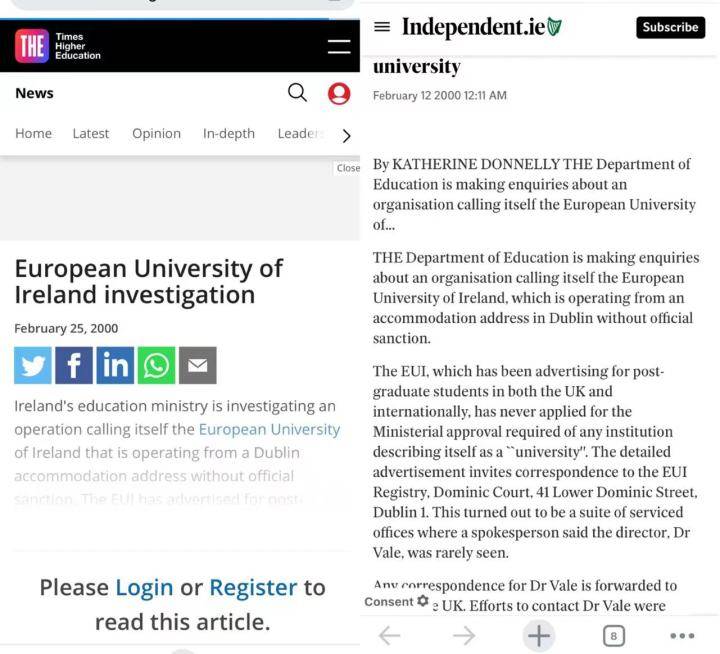 2000年2月25日,以大学排名而闻名的英国《泰晤士报高等教育副刊》就曾报道,爱尔兰教育部门正在调查一个未经官方批准就自称为“爱尔兰欧洲大学”机构的运营,这个机构地址为爱尔兰首都都柏林的一个宿舍。“爱尔兰欧洲大学”在英国和国际上做广告,招收研究生学历以上的学生,但实际上从未向爱尔兰官方申请“大学”身份的许可。