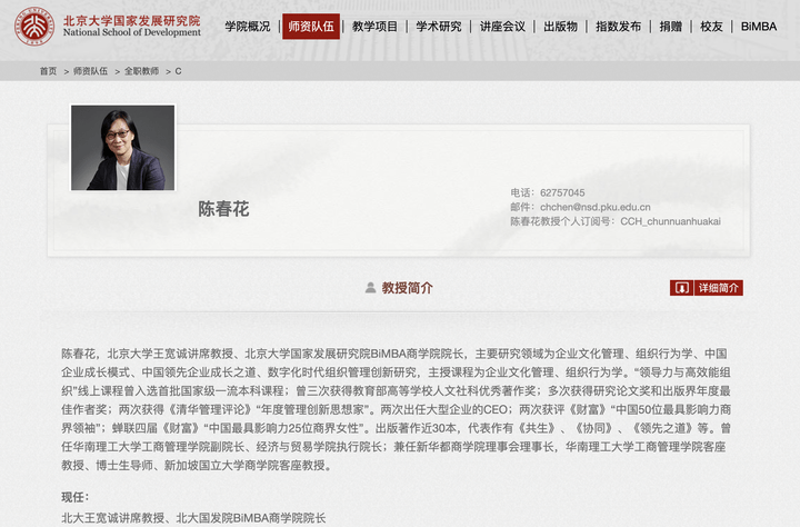 北京大学国发院网站显示,陈春花为全职教授,但并没有列出其教育背景。但在2022年7月18日的百度快照中,北京大学国发院网站曾写出一条教育背景,即“南京大学商学院企业管理博士后(2005年)”,说明这条教育背景刚于近期被删除。