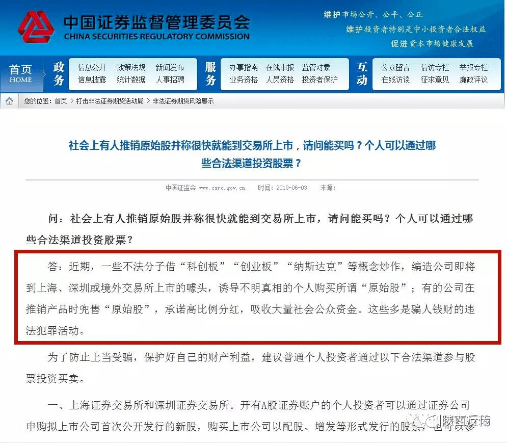 中国证券监督管理委员会官网发布了关于证券期货风险警告,提示投资人小心原始股骗局。尤其是互联网项目中的“股权”,很难找到真正的“原始股”,其实都是圈钱,瓜分钱的游戏而已。