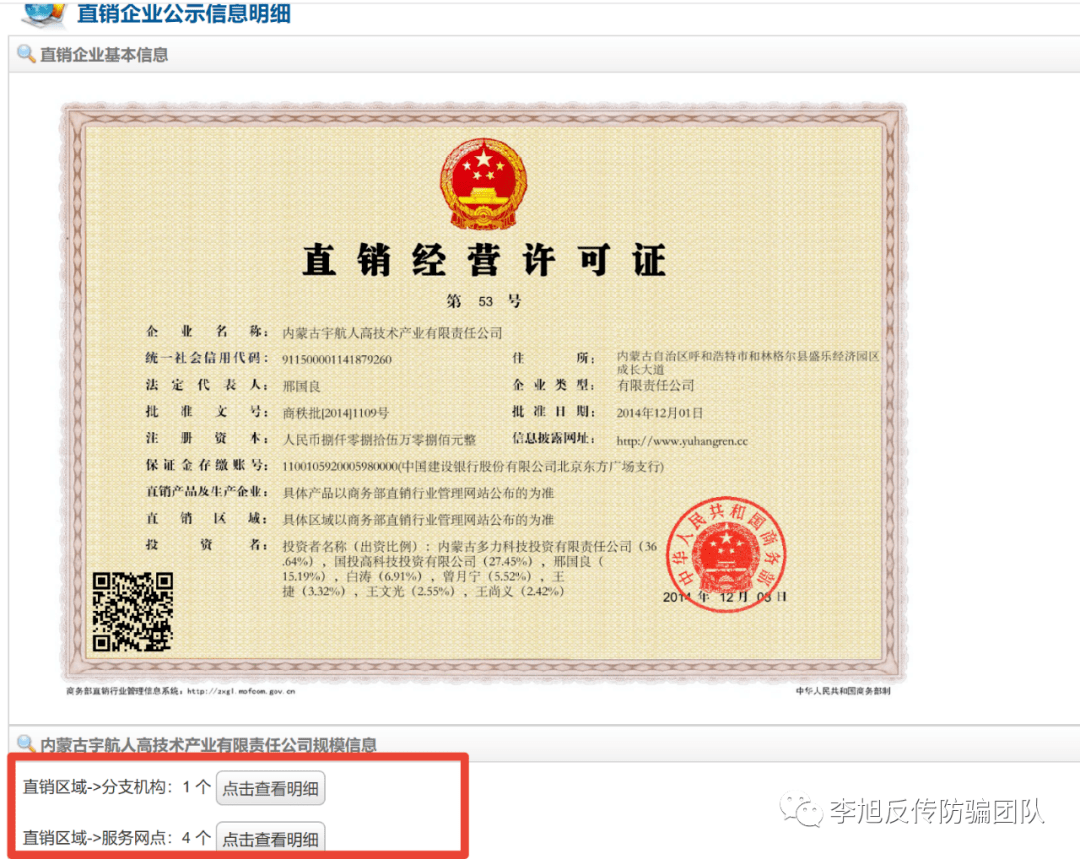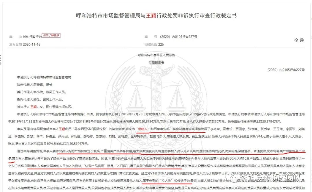 2020年11月,中国裁判文书网发布了一则行政裁定书,显示宇航人广和百草事业部因涉嫌传销被呼和浩特市市场监督管理局予以行政处罚。