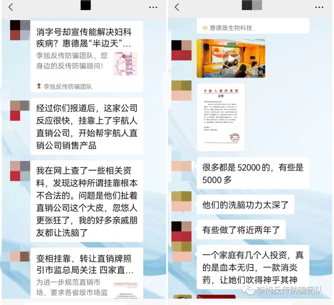 2022年5月,李旭反传防骗团队接到网友的反馈,其家人加入一个名为“惠德晟”的私护品牌新零售平台,某经销商宣称该平台的产品可以助人怀孕、使HPV高危病人阳转阴等一系列神奇效果。在我们调查之后,将该平台涉嫌虚假宣传、模式涉嫌传销一事进行了曝光。(文章详情点击链接:消字号却宣传能解决妇科疾病?惠德晟“半边天”私护品牌被网友质疑虚假宣传、涉嫌传销)