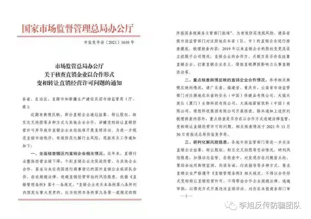 2021年10月,国家市场监督管理局办公厅发布《关于核查直销企业以合作形式变相转让直销经营许可问题的通知》(简称“《通知》”)。《通知》中指出,部分直销企业通过挂靠、转让股权、相互交叉持股等多种方式与其他企业合作,涉嫌变相转让直销经营许可并导致非直销企业未经批准开展直销活动。