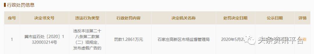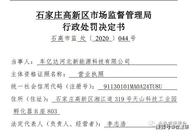 下面,再来看看围绕着车亿达公司的行政处罚与诉讼事件。2020年5月29日,车亿达河北新能源科技有限公司因发布虚假广告遭到了石家庄高新区市场监督管理局罚款一万两千多元的行政处罚。