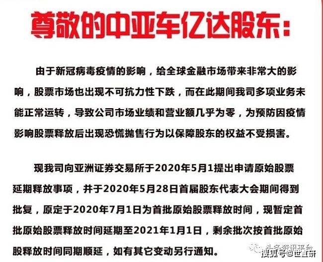 顺带一提,当时间来到2020年6月1日时,公众号“广江集团”(该公众号原名“车亿达优油乐”)还发布了一篇《中亚车亿达股票释放延迟通知》。《通知》称,“……此期间我司多项业务未能正常运转,导致公司市场业绩和营业额几乎为零……原定于2020年7月1日的首批原始股票释放时间,暂时延期至2021年1月1日。”