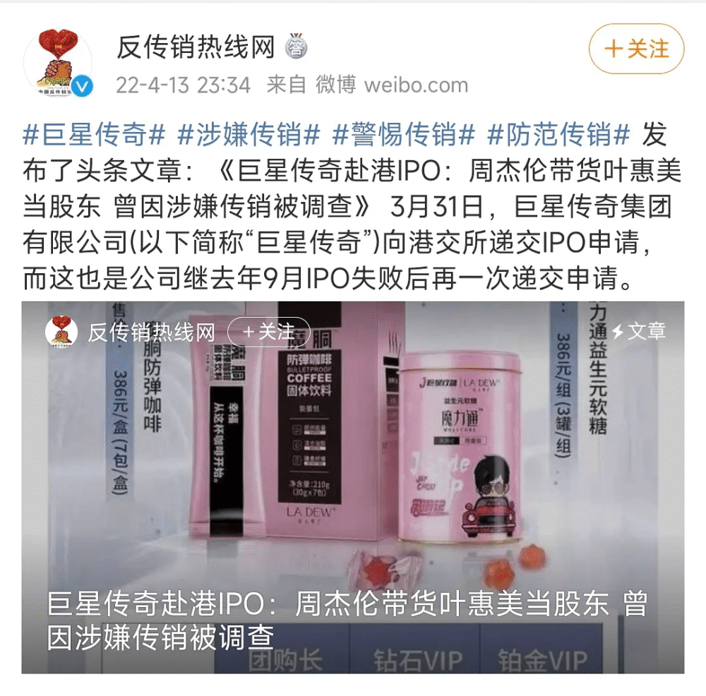 近日,一个蓝V博主发布的一篇明星传销文章,引发了热议,这篇文章是在4月份发布的,当时并没有引发多少讨论,但在5月初被网友搬运到了论坛,瞬间引发了大规模热议,该文章直指与周杰伦有莫大关联的巨星传奇集团,曾因为涉嫌传销被调查。