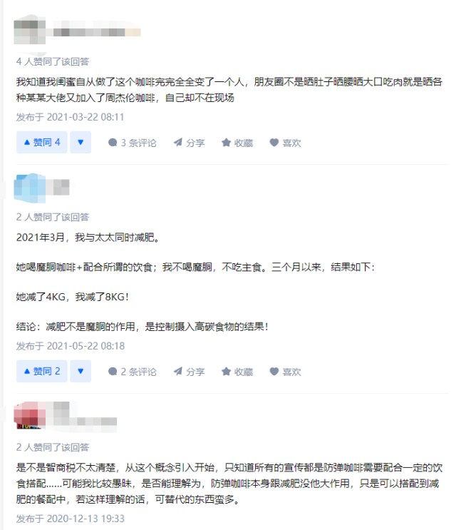 在知乎,有网友对魔胴咖啡这样评论:我知道我闺蜜自从做了这个咖啡完完全全变了一个人,朋友圈不是晒肚子晒腰晒大口吃肉就是晒各种某某大佬又加入了周杰伦咖啡,自己却不在现场。