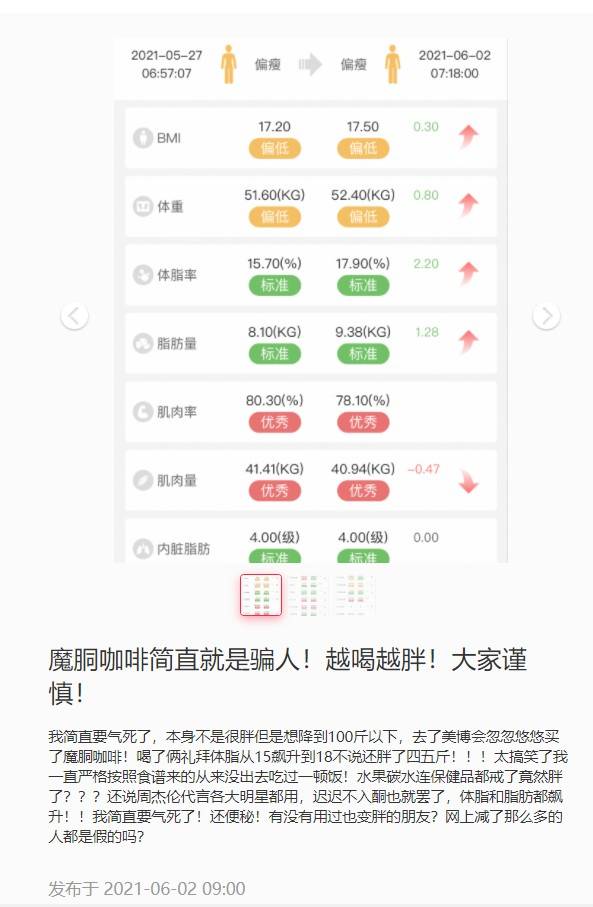 2021年6 月2日,有网友在小红书爆料称“魔胴咖啡简直就是骗人!越喝越胖!大家谨慎!”。文章称:我简直要气死了,本身不是很胖但是想降到100斤以下,去了美博会忽忽悠悠买了魔胴咖啡!喝了俩礼拜体脂从15飙升到18不说还胖了四五斤!!!太搞笑了我一直严格按照食谱来的从来没出去吃过一顿饭!水果碳水连保健品都戒了竟然胖了???还说周杰伦代言各大明星都用,迟迟不入酮也就罢了,体脂和脂肪都飙升!!我简直要气死了!还便秘!有没有用过也变胖的朋友?网上减了那么多的人都是假的吗?