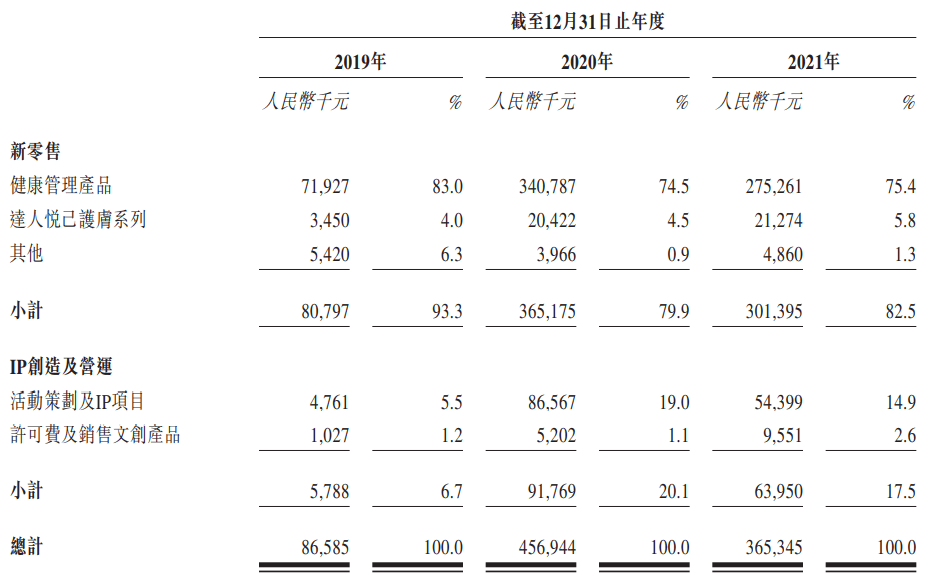 招股书显示,其新零售业务的大部分收入来自魔胴咖啡的销售。公司称,这是一种专为低碳水化合物饮食计划而设计的高脂肪及充足蛋白质饮料,并还在魔胴子品牌旗下推出多款其他低碳水化合物饮品及食品。2021年上述健康管理产品共实现收入2.75亿元,占其总收入的75.4%。