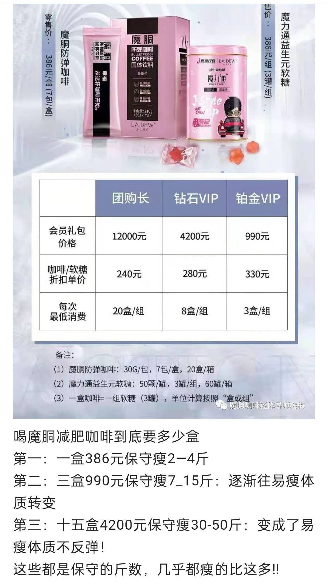 记者以“魔胴咖啡 代理”为关键词进行网上搜索,发现不少相关代理广告,其内容显示,魔胴咖啡品牌有四个代理级别。其中,一次性购买990元的产品就成为铂金VIP会员,购买4200元产品就成为钻石VIP会员,购买12000元产品就成为团购长,这几个级别的都属于团购会员,不属于代理商。如果投资32000元就可成为战略经销商,享有经营权益。
