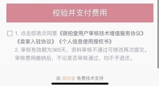 微拍堂的开店流程非常复杂,除了要求林先生提供营业执照和银行对公账户以外,还需要缴纳“检验费用”,并且该费用高达1800人民币。