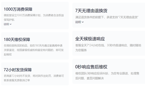 为了保护消费者权益,微拍堂设立的“1000万消费保障”,承诺“七天无理由退货”、“30秒极速响应”等。但微拍堂又专门解释:“买家应当知悉,微拍堂作为平台并没有对卖家行为的赔付义务,相关赔付义务是卖家义务而不是微拍堂义务,此处的‘赔’‘赔付’仅指微拍堂主动地、额外地以调解方式为受损失买家提供一定的权益及服务。”