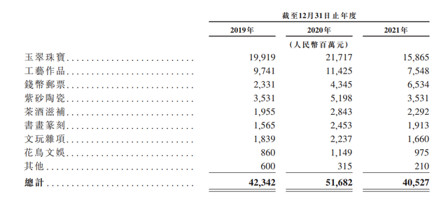 从拍卖量来看,以玉翠珠宝、工艺作品、钱币邮票等为主,三者分别占本整体GMV的39.1%、 18.6%、 16.1%。
