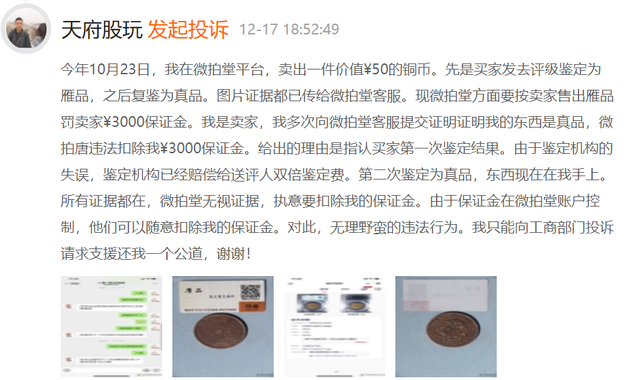 有卖家在黑猫平台称,在微拍堂卖出铜币,被买家鉴定为赝品,后来又复鉴为真品,但是微拍堂却要以出售赝品为由,扣除3000元的保证金。