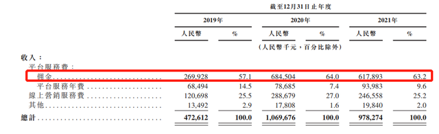 微拍堂的收入来源主要包括平台服务费(包括佣金及平台服务年费)、在线营销服务费等, 2021年平台的佣金收入达到63%。