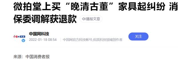 今年1月,中国消费者报报道,有江苏消费者通过“微拍堂”以2万多元的价格拍下了一套“晚清古董”家具,收到货后发现是假的,想要退货,但联系不上商家,后在消保委协调下获得退款。