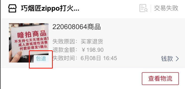 《中国消费者报》通过查看张先生提供的订单截图发现,其所竞拍到的商品封面图中有文字显示:“暗拍商品,不支持七天无理由退货,成人游戏理性消费,付款后发1确认”,但同时该图片右下方又显示“包退”二字,两者明显相悖。