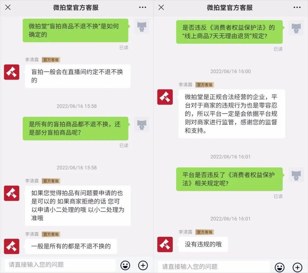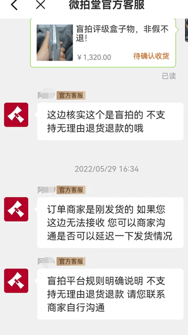 “6月8日,我在微拍堂平台‘巧烟匠Zippo打火机’店盲拍了21单,交易金额共7100元。拍之前不知道是什么,但拍到后发现物品价值远远不及拍卖价格,商家设置低价起拍,存在诱惑性购买的嫌疑。我申请退货退款,但商家和微拍堂平台均以‘盲拍商品不退不换’为由拒绝。”