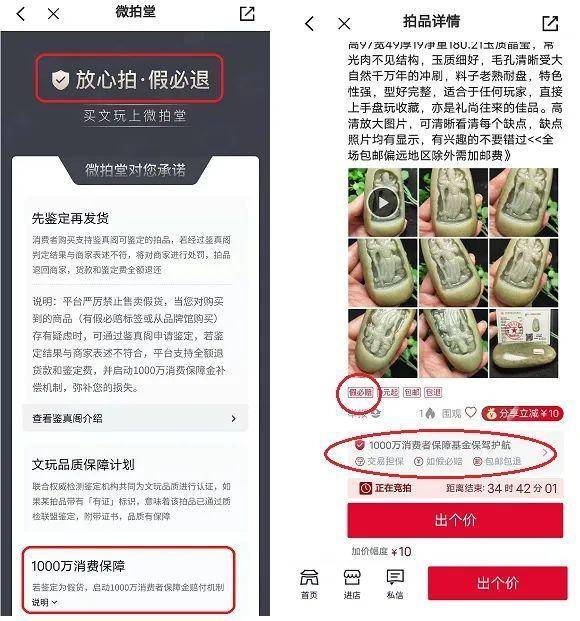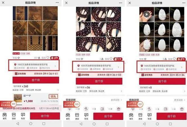 ▲记者通过微拍堂公众号随机查看的不同拍品均标有“1000万消费者保障基金保驾护航”字样。资料图片