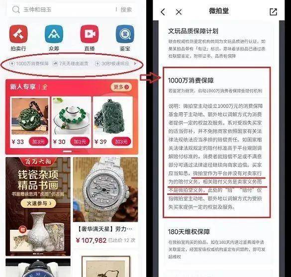“说明:微拍堂主动设立1000万元的消费保障基金用于主动地、额外地以调解方式为消费者提供一定的权益及服务。系对受损失买家的适当弥补,并不免除商家依照国家有关法律法规依法应当承担的赔偿责任。如国家相关法律法规规定的赔付标准高于平台规则调解赔付标准的,消费者就赔偿不足或不满意部分可通过法律途径继续向商家追偿。”