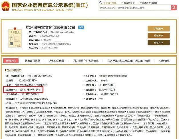 ▲国家企业信用信息公示系统显示杭州微拍堂文化创意有限公司注册资金为168万元。资料图片