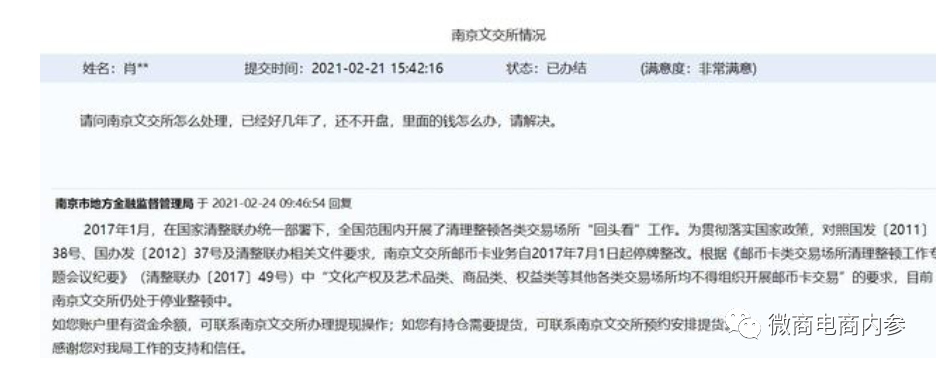 时至今日,曾以邮币卡闻名的南京文交所仍处于停业整顿状态。2021年2月24日,南京市地方金融监督管理局在回复网友咨询时表示:2017年1月,在国家清整联办统一部署下,全国范围内开展了清理整顿各类交易场所“回头看”工作。为贯彻落实国家政策,对照国发〔2011〕38号、国办发〔2012〕37号及清整联办相关文件要求,南京文交所邮币卡业务自2017年7月1日起停牌整改。根据《邮币卡类交易场所清理整顿工作专题会议纪要》(清整联办〔2017〕49号)中“文化产权及艺术品类、商品类、权益类等其他各类交易场所均不得组织开展邮币卡交易”的要求,目前南京文交所仍处于停业整顿中。