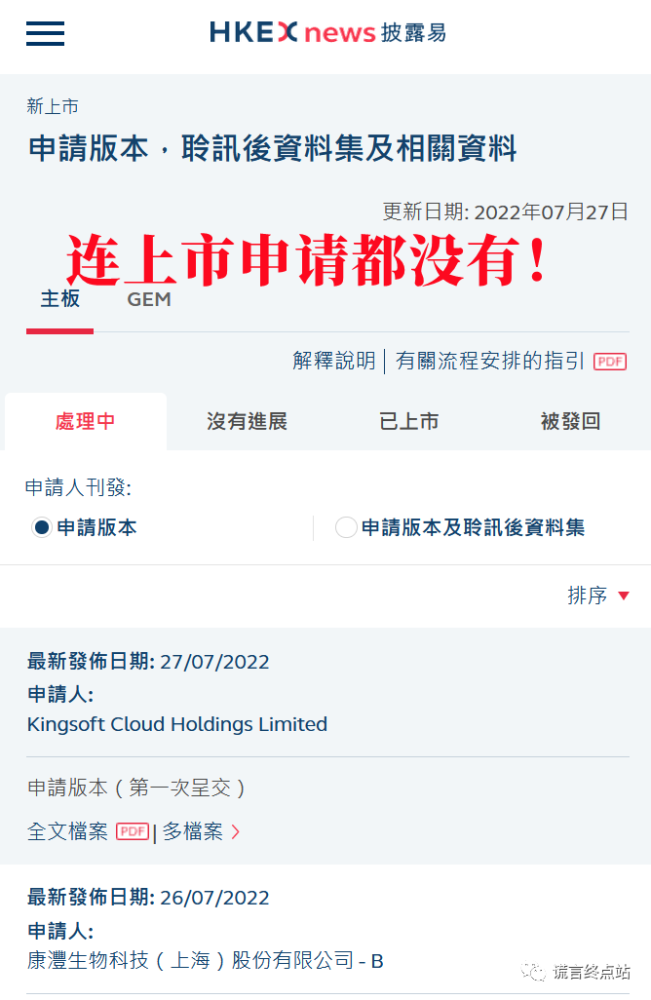 任何一家公司在港交所上市,至少应在两个月前在港交所提交上市申请,且能在港交所披露易网站公开查询;同时,上市两周前应在港交所披露易网站发布上市公告,其中包含股票代码和上市日期。连代码都没有,怎么上市?