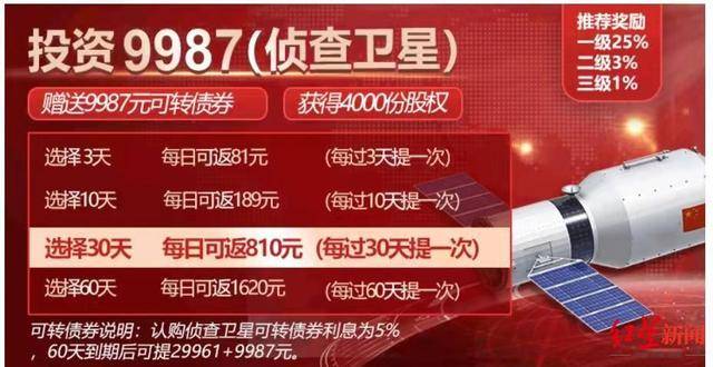 通信卫星也可以当理财投资了?是的,你没看错。据媒体报道,这款名为神舟星链的APP,居然打着航天的噱头卖起了理财产品,投资价值654元的通信卫星,选择3天每日可返4.5元,选择30天每日可返45元等等,年化收益率最高约为83%。