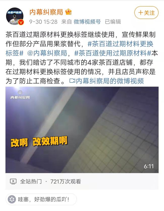 古茗奶茶被爆使用过期原料 武汉市场监管局已介入调查