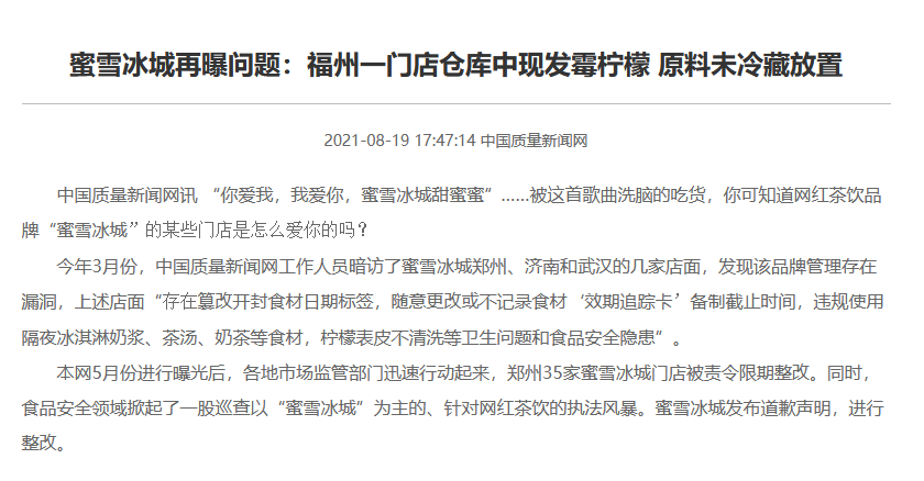2021年8月11日,福州市市场监管局抽取了蜜雪冰城进行检查,发现了一些问题:仓库中发现发霉柠檬,8月10日调制的糖浆、奶制品未密闭保存,且无冷藏直接在室温下放置到11日下午等。