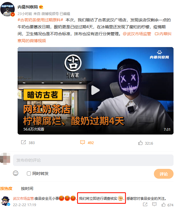 近日,有博主向武汉市场监管部门举报:武汉网红奶茶店古茗,柠檬腐烂、酸奶过期!目前,有关部门已介入调查,该门店已停业。