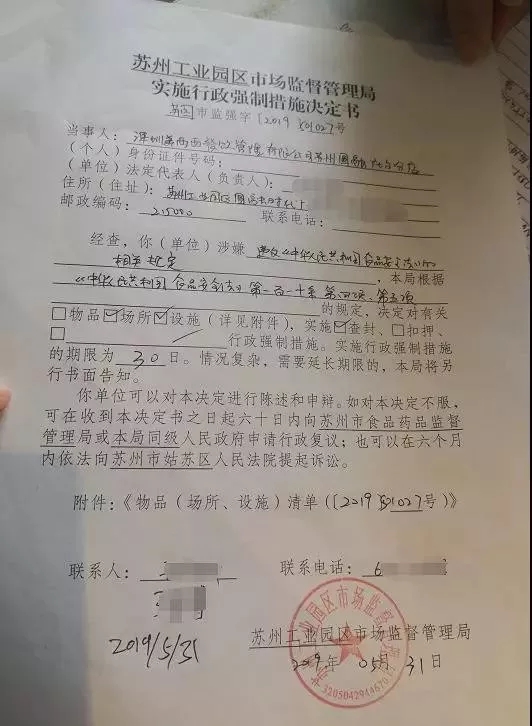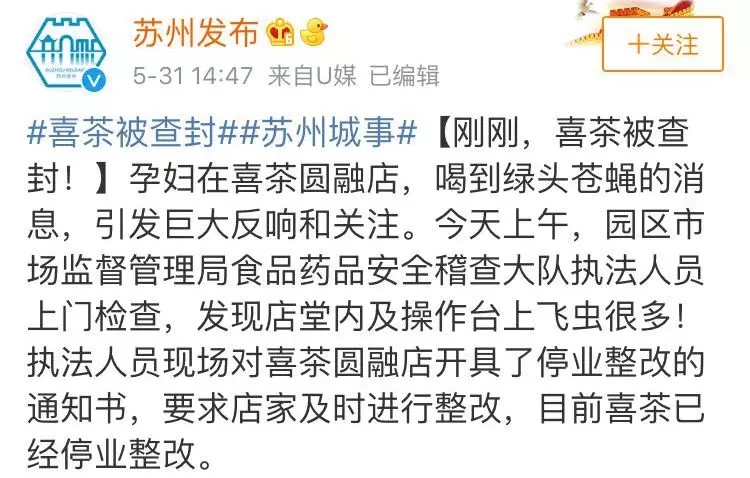 2019年5月31日,苏州园区市场监督管理局食品药品安全稽查大队执法人员,对喜茶苏州圆融店开具了停业整改的通知书。据了解,喜茶被当地市场监督管理局关注的起因是,孕妇王女士在店内购买的果茶中喝到绿头苍蝇。当天,喜茶苏州永旺梦乐城店也被要求整改,整改原因是餐具用具清洗消毒设施不足。