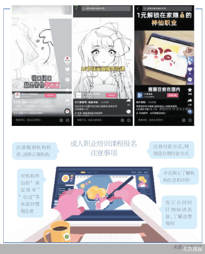 “学完就能接单!”“开启第二副业!”近日,北京商报记者从多个平台发现,信息流广告开始推荐大量配音、插画等泛职业培训类课程。以插画课为例,宣传课程的机构往往先用低价体验课吸引受众,然后在学员上过几节直播课后推销大容量课包,并承诺可提供接单服务,吸引学员报名。打着“0基础可学”“能快速变现”的噱头,市面上的插画课究竟质量如何?带着这样的疑问,北京商报记者展开了调查。
