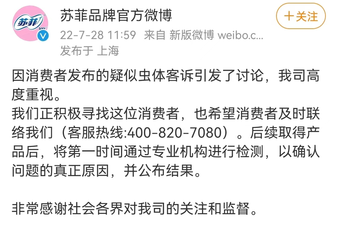 随着舆论的发酵,苏菲官方微博发布声明称:“因消费者发布的疑似虫体客诉引发了讨论,我司高度重视。我们正积极寻找这位消费者,也希望消费者及时联络我们。后续取得产品后,将第一时间通过专业机构进行检测,以确认问题的真正原因,并公布结果。”