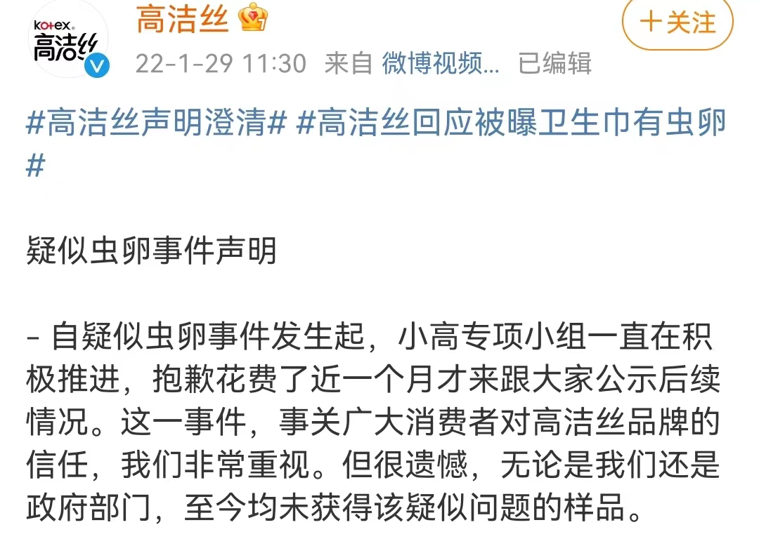 针对疑似虫卵事件,高洁丝方回应称,消费者未提供样品以举证调查,并自行确认撤销了本次投诉,微博联系消费者确认事实,并承诺可以邀请第三方公证人员全程公证,但最终该消费者未提供联系方式及未再回复消息。