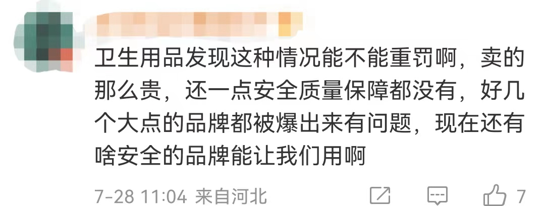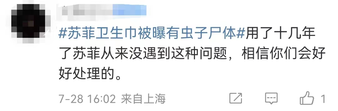 7月28日,“苏菲卫生巾被曝有虫子尸体”相关词条登上微博热搜,卫生巾安全问题似乎已成为常有的事情,高洁丝、七度空间都曾先后被质疑有异物。
