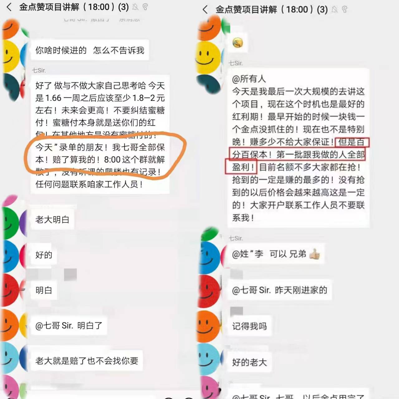 二,第二天把求助者李某被拉到一个叫(有情有意七家人)的微信群,再加到七哥私人微信,就讲金点赞项目怎么做,他会推荐一个微信名叫,元帥的助理,具体讲如何赚钱。
