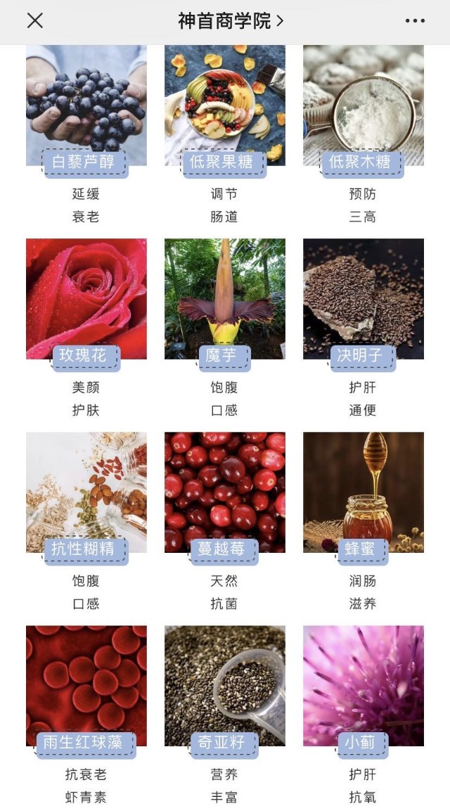 浙江神首生物科技有限公司注册的微信公众号“神首商学院”,在“学员宝典”栏目的“干货分享”里,介绍了几款产品。