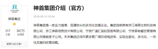 神首集团官方介绍称:神首集团是一家实力雄厚、底蕴悠长的多元化发展企业。集团目前拥有浙江神首生物科技有限公司、浙江神首信息技术有限公司、宁波广通汇国际贸易有限公司、宁波首咖餐饮管理有限公司等数家子公司。未来集团还将向更多更广阔的领域进军,实现全面化、多元化、一体化发展的经营战略。