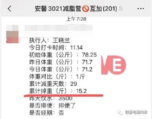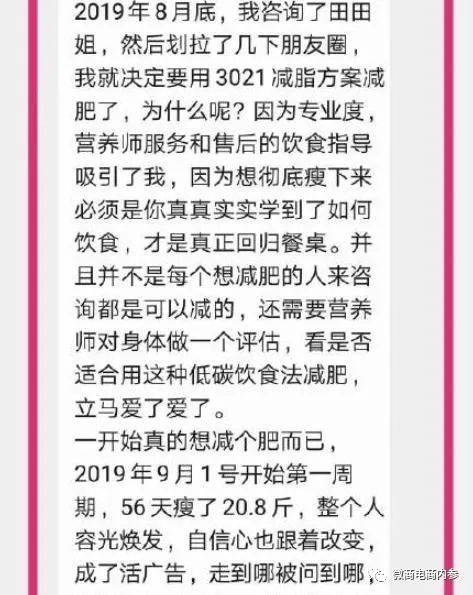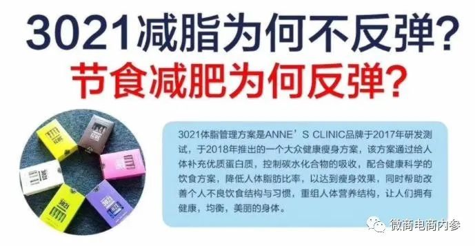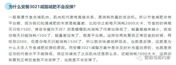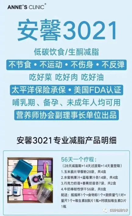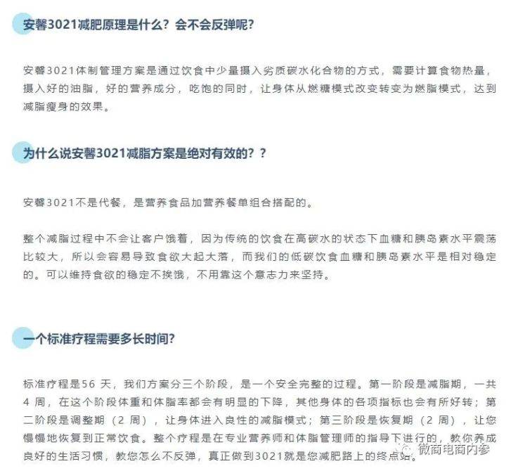 按照公众号“安馨3021陶姐减脂营”的说法,安馨3021其实就是一种饮食减肥法,通过调整日常的饮食结构,以较少碳水化合物的摄入就可以达到减肥的目的。公众号“清荷食养”的解读也无外其中:3021减脂是给顾客一整套饮食搭配方案(3021产品+健康一日四餐,加营养师一对一服务)。